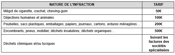 Face à ce constat et afin de limiter les frais, il est proposé au conseil municipal d’instaurer des forfaits d’enlèvement, de nettoyage et de remise en état de l’espace communal public ou privé qui seront appliqués à toute personne identifiée ayant effectué des dépôts illicites constatés sur le territoire de la commune.